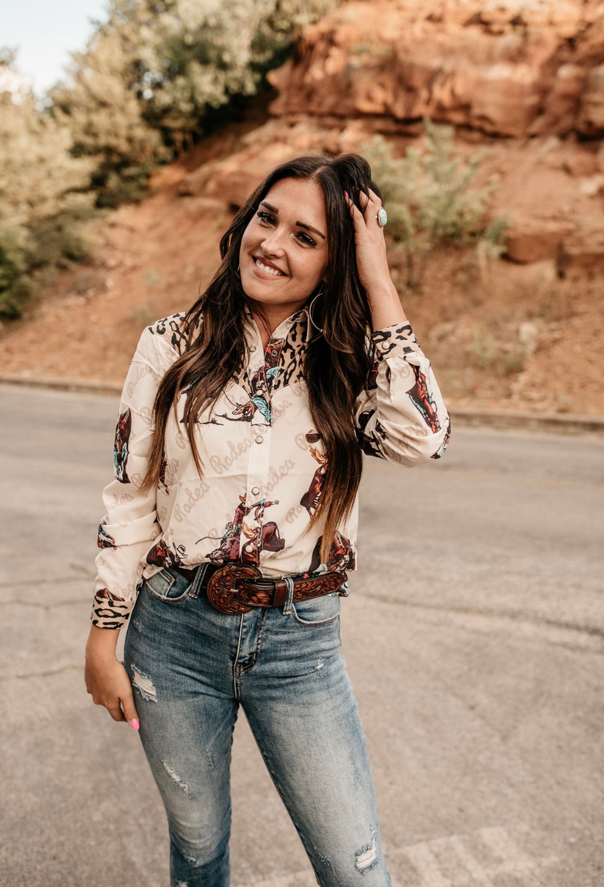 1 1/2 inch wide tooled leather belt with removable belt buckle