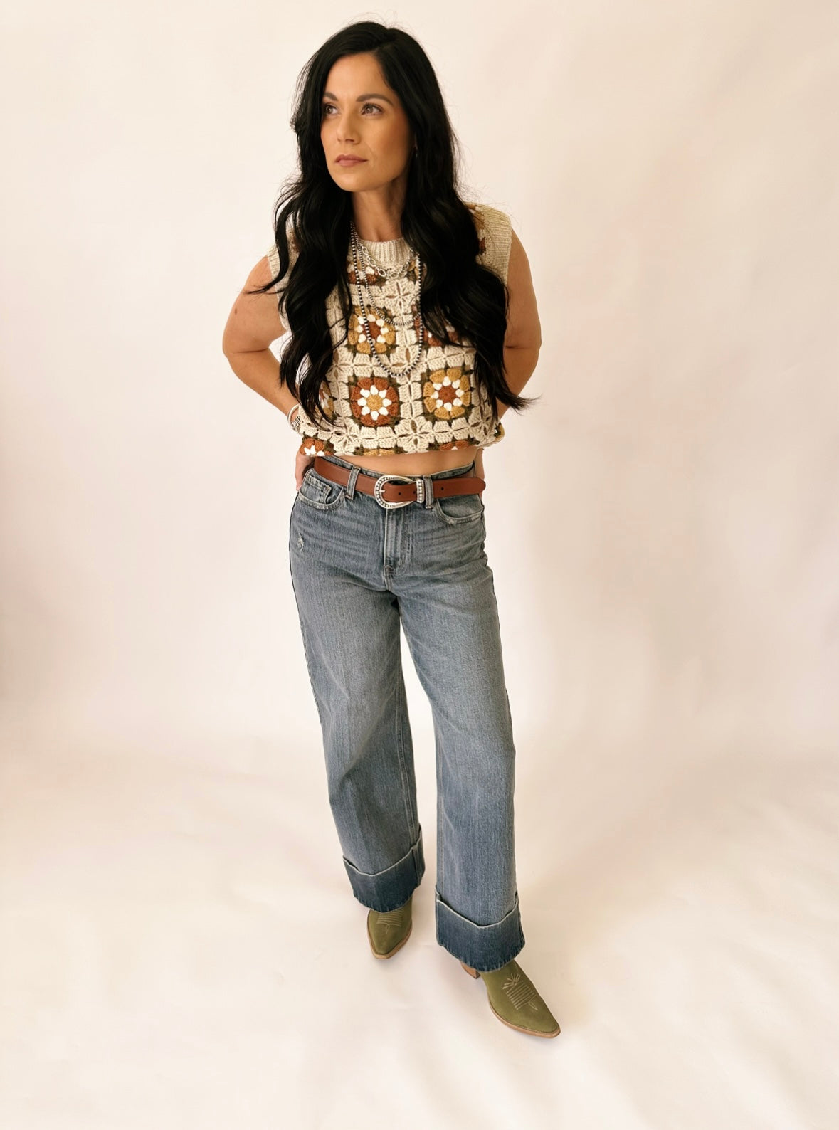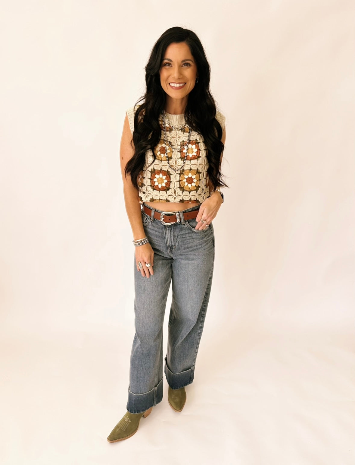 I’m a size 2 wearing a small. I have it tucked up in my tucky to give that cropped look.